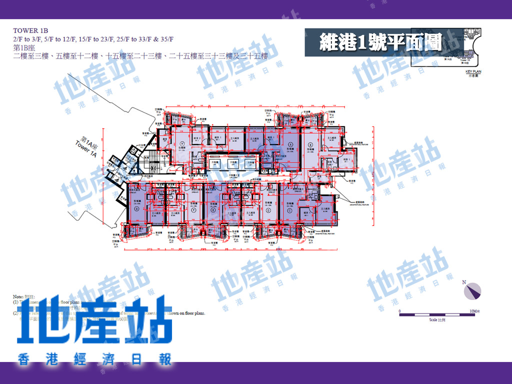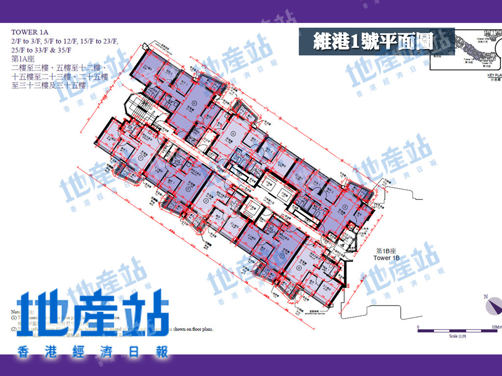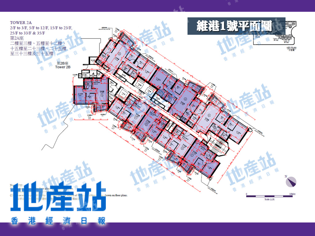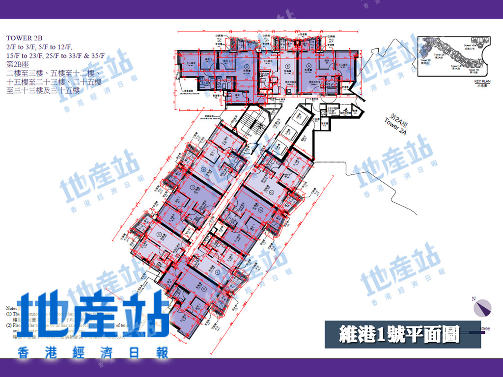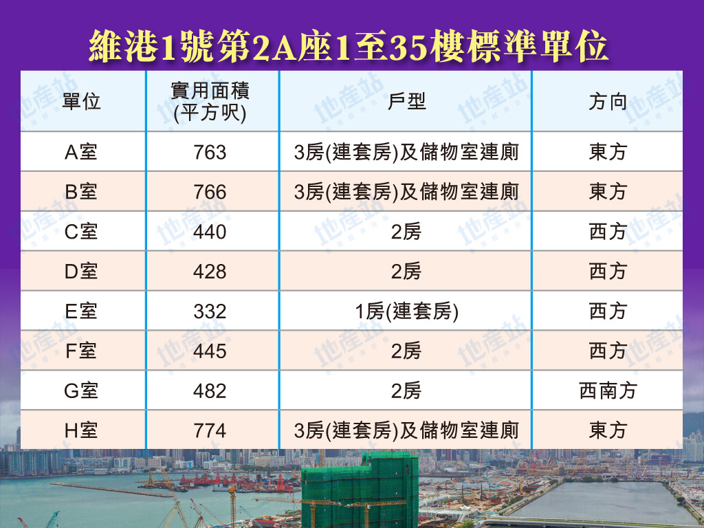 維港1號第2座住宅共32層,拆分2A及2B兩翼,當中2A座1至35樓為例,1層共8伙單位,可以方向劃分,包括東面、西面及西南面單位。