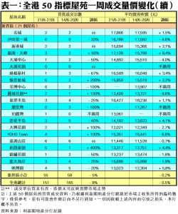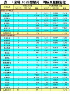 至於,新界區21個指標屋苑上周共錄55宗交投,按周減少3宗或8%,其中綠楊新村只錄得1宗成交,較前周的3宗減少67%;大埔中心及錦繡花園各自僅錄1宗買賣,分別較前周的2宗減少50%;碧堤半島交投量由前周的5宗,減少40%至上周的3宗;沙田第一城成交量則按周減少33%,上周錄得6宗買賣;盈翠半島及藍天海岸交投量雙雙由前周的4宗,減少25%至上周的3宗;映灣園期內錄得4宗成交,按周減少20%。此外,在全港50個指標屋苑當中,上周共有7個屋苑錄得「零成交」,較前周的6個增加17%,當中九龍區及新界區各佔3個,港島區則佔1個 (詳見表一)。