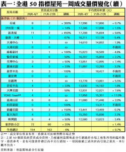 至於,新界區21個指標屋苑上周共錄72宗交投,按周增加20%,其中新港城連錄11宗成交,較前周的2宗急增4.5倍;名城及錦繡花園各自錄得8宗及5宗買賣,分別較前周大增3倍及1.5倍;綠楊新村交投量由前周的1宗,增加1倍至上周的2宗;荃灣中心及映灣園分別錄得3宗及6宗買賣,按周各自增加50%;麗城花園、碧堤半島及藍天海岸各錄4宗成交,按周分別增加33%;沙田第一城成交量則按周增加14%,期內錄得8宗買賣。此外,在全港50個指標屋苑當中,上周共有10個屋苑錄得「零成交」,較前周的6個增加67%,當中九龍區及新界區各佔5個及4個,港島區則佔1個 (詳見表一)。