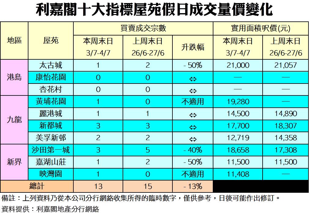 《利嘉閣十大指標屋苑假日二手實況》 二手供應少價格升 料樓價快將創歷史新高 十大屋苑周末13宗買賣 按周減少2宗 研究報告 2021-07-05 by Chan Derek · Published 2021-07-05