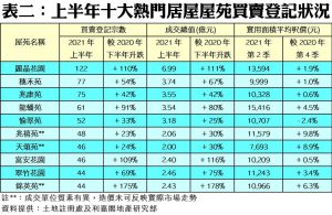 從屋苑層面分析,上半年十大活躍成交屋苑中,全線10個屋苑買賣登記量報升,增幅介乎23%至1.75倍不等,其中馬鞍山錦英苑增幅最大,屋苑期內錄得44宗買賣登記,成交總值約2.43億元,較去年下半年分別大增1.75倍及1.78倍。而上半年登記最活躍屋苑為九龍灣麗晶花園,共錄122宗成交,總值涉及6.99億元,量值按半年同增1.1倍。