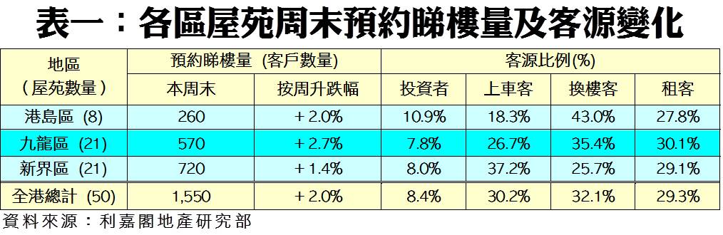 利嘉閣地產研究部主管陳海潮表示,現時市場氣氛較為平穩,買家置業意欲仍然不俗,而一手市場欠缺焦點,資金續在二手市場覓盤,周末預約睇樓客量輕微上升。根據利嘉閣地產研究部數據估算,全港50個指標屋苑共錄1,550組客戶於周末預約睇樓,按周上升2.0%。二手樓價高企不下,普遍屋苑缺乏平價筍盤,而業主屬較為強勢一方,買家入市或需進一步調高出價。