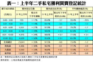 綜合土地註冊處資料所得,2021年上半年本港共錄23,041宗私宅轉手獲利買賣登記,佔同期已知上手買入價的二手私宅買賣比例達97.46%,創近10個「半年度」(即五年)新低,並較去年下半年的97.49%跌0.03個百分點,為連續6個「半年度」錄得跌幅,若同比2020上半年的98.02%更跌達0.56個百分點。