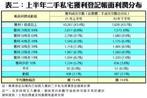 平均獲利幅度方面,上半年每宗私宅轉手個案平均賺幅為73.4%,較去年下半年跌1.2個百分點,為近9個「半年度」以來的次低水平,並連續3個「半年度」維持在極窄幅徘徊。當中,沽樓獲利1倍或以上的轉手個案共10,267宗,佔整體二手私宅買賣比例有所下跌,由去年下半年的43.7%,微跌0.3個百分點至今年上半年的43.4%。至於上半年錄得虧損的轉手個案共有508宗,佔整體比例2.1%。