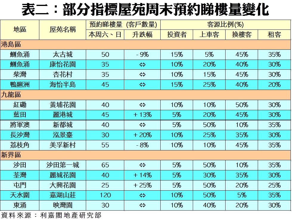 利嘉閣地產研究部主管陳海潮表示,儘管股市近日非常波動,但樓市整體氣氛仍然暢旺,預期本港利率維持低企,樓價將上衝破頂,周末預約睇樓客量續向好。根據利嘉閣地產研究部數據估算,全港50個指標屋苑共錄1,590組客戶於周末預約睇樓,按周再升1.0%,連升三周,創近17周次高。政府派發電子消費券,估計市面人流將有所增加,買家對本港經濟復甦信心增強,利好二手後市發展。