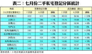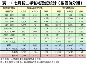 今年七月份,按二手私宅價值分類(見表一),9個價格組別的買賣登記量錄得五跌三升一持平,跌者當中,以5,001萬至1億元的組別跌幅最大,由六月的35宗減少20%,至上月的28宗;其次,登記量佔比最高的601萬至800萬元的組別亦跌11%至1,274宗。至於登記量佔比次高的401萬至600萬元組別則錄得1,204宗,按月微升4%。