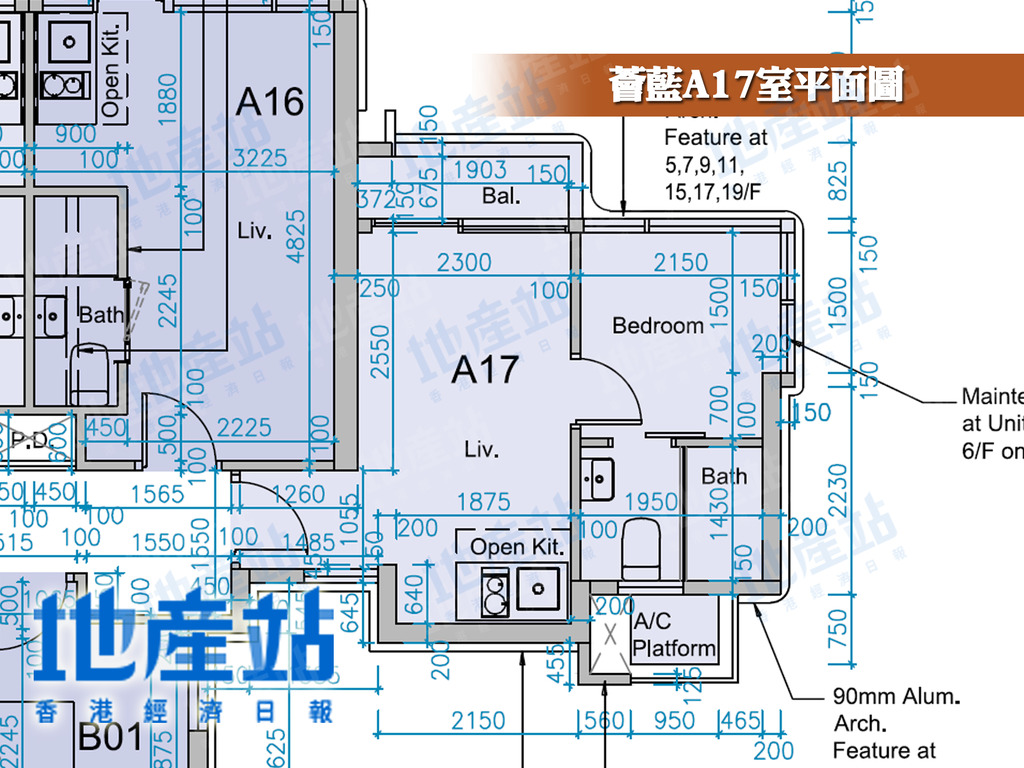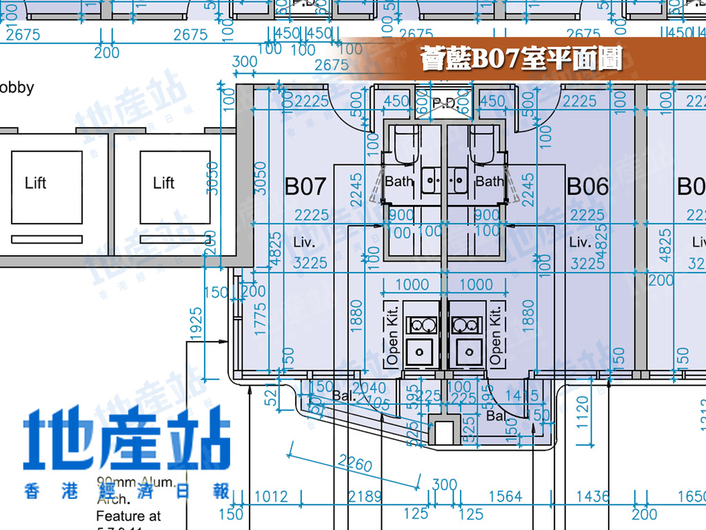 薈藍開放式單位景觀方面,只有分向北單位及向南單位,向北單位屬於A02至A16室,視乎樓層,可望到海景及荃灣景觀;至於向南開放式單位只有6伙,屬於B01至B07室單位,當中B01及B07室單位,設有L形賞景曲尺窗,而B07室單位露台亦以梯形設計。