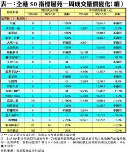 至於,九龍區21個指標屋苑上周共錄46宗買賣,按周增加15%,其中海濱南岸及昇悅居各錄3宗及4宗買賣,分別較前周大增2倍及3倍;宇晴軒及美孚新村則分別有2宗及8宗成交,按周增幅各達1倍;黃埔花園、海逸豪園及將軍澳中心各自錄得3宗成交,按周分別增加50%;淘大花園交投量由前周的3宗,增加33%至上周的4宗。此外,在全港50個指標屋苑當中,上周共有10個屋苑錄得「零成交」,與前周的數量相同,當中港島區及九龍區各佔1個及2個,新界區則佔7個(詳見表一)。