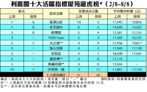 在上周十大活躍成交屋苑當中,有8個屋苑錄得交投上升,成交增加1至5宗不等。當中嘉湖山莊交投表現凌厲,由前周5宗成交倍增至上周10宗,同時成為上周最熱賣屋苑。