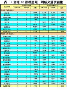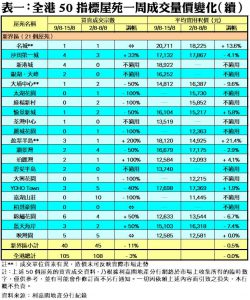 至於,港島區8個指標屋苑上周共錄24宗成交,按周增加41%,其中康怡花園及南豐新村各錄4宗及2宗成交,分別按周大增1倍;杏花村交投量由前周的3宗,增加67%至上周的5宗;藍籌屋苑太古城及海怡半島,分別錄得6宗及3宗成交,各自按周增加50%。此外,在全港50個指標屋苑當中,上周共有12個屋苑錄得「零成交」,較前周的8個增加50%,當中九龍區及新界區各佔5個及6個,港島區則佔1個(詳見表一)。