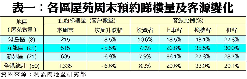 九龍區方面,21個指標屋苑於本周末暫錄515組客戶預約睇樓,按周下跌5.5%。利嘉閣地產調景嶺分行(A組)經理黃金欽指出,現時都會駅普遍3房單位叫價均低於一千萬元,在新按保政策下可承造最多八成按揭,故即使樓價在高位徘徊,仍不乏換樓客決定入市,本月至今都會駅成交量已達上月全月水平。黃金欽又指,即使區內屋苑屢錄破頂成交,但樓市剛需強勁,優質單位尤為渴市,本周末都會駅預約睇樓量按周上升。