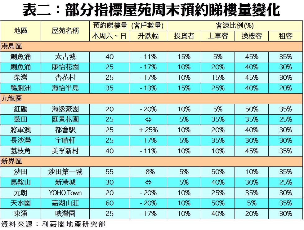 利嘉閣地產研究部主管陳海潮表示,普遍二手業主不願減價,部分購買力轉投近日火熱的一手陣營,周末預約睇樓量下挫。根據利嘉閣地產研究部數據估算,全港50個指標屋苑共錄1,335組客戶於周末預約睇樓,按周急跌6.6%,連跌三周並創26周新低。美國聯儲局即將「收水」,加上近日港股接連下挫,不利因素令市場情緒變得觀望,買家入市態度趨審慎,估計二手屋苑短期表現較牛皮拉鋸。