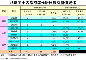 《利嘉閣十大指標屋苑假日二手實況》 十大屋苑周末錄15宗買賣 近三周最多 新盤銷售後釋放購買力 客源回流二手