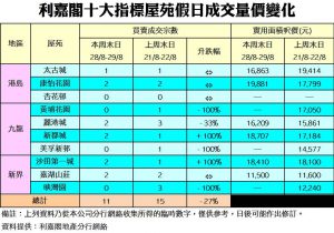 利嘉閣地產總裁廖偉強表示,鑑於本港股票市場持續波動,加上自早前樓價破頂後持續於高位徘徊,導致業主及買家於議價過程保持拉鋸狀態,令剛過去的周末二手交投量有所下降。綜合利嘉閣地產分行網絡數據,在過去的周末日(8月28至8月29日)十大指標屋苑累錄11宗二手成交個案,較上周末(8月21至8月22日)的15宗減少4宗或約27%。