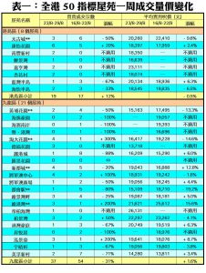 至於,港島區8個指標屋苑上周共錄19宗成交,按周增加12%,其中康怡花園連錄6宗成交,較前周的5宗增加20%;南豐新村、鯉景灣、嘉亨灣及杏花村均突破前周「捧蛋」的淡局,上周分別錄得1宗至2宗成交;不過,太古城及藍灣半島期內分別只錄3宗及1宗成交,按周各自減少50%及67%。此外,在全港50個指標屋苑當中,上周共有7個屋苑錄得「零成交」,較前周的11個減少36%,當中九龍區及新界區各佔5個及2個,港島區則全線屋苑均有錄得成交(詳見表一)。
