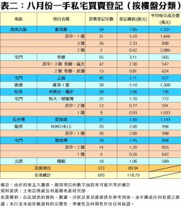 按樓盤分類(見表二),屯門帝御‧嵐天上月共錄42宗登記,成為八月份登記量最多的一手私宅項目,登記總值達2.3億元,平均每宗登記約547萬元;次名為同區上嵐的40宗,而第三則是啟德維港1號的39宗登記。至於排行榜內上月平均每宗買賣成交價最高者為西南九龍維港匯2期的2,086萬元,而上嵐的527萬元則為較低平均價者。