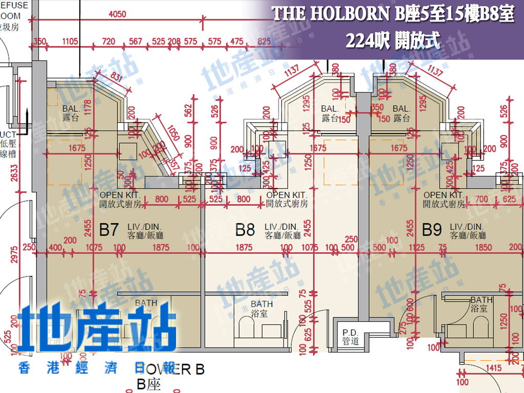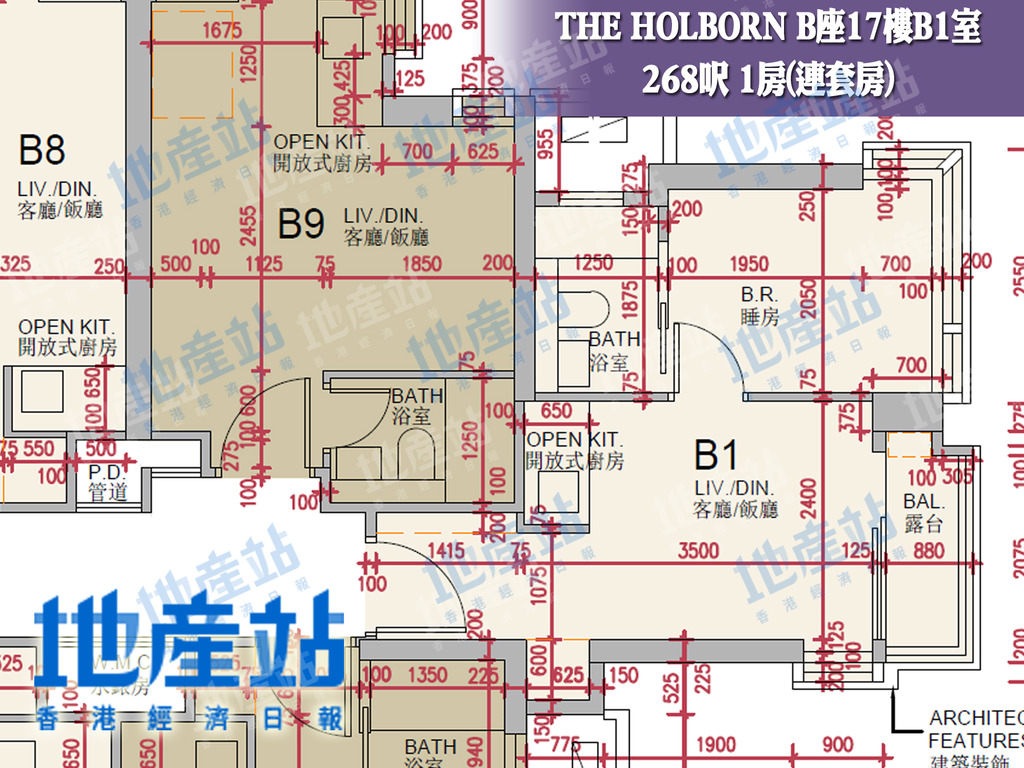 THE HOLBORN B座17樓B7室單位,入屋右邊設有交樓附送裝置,另一邊為長1.27米及闊1.25米的儲物室,客飯廳四正,開放式廚房設於角落位,廳區連接22平方呎梯形設計露台,不設走廊,睡秀間隔四正。長2.43米及闊3.27米,隨樓附設專屬衣櫃,房內設有浴室。