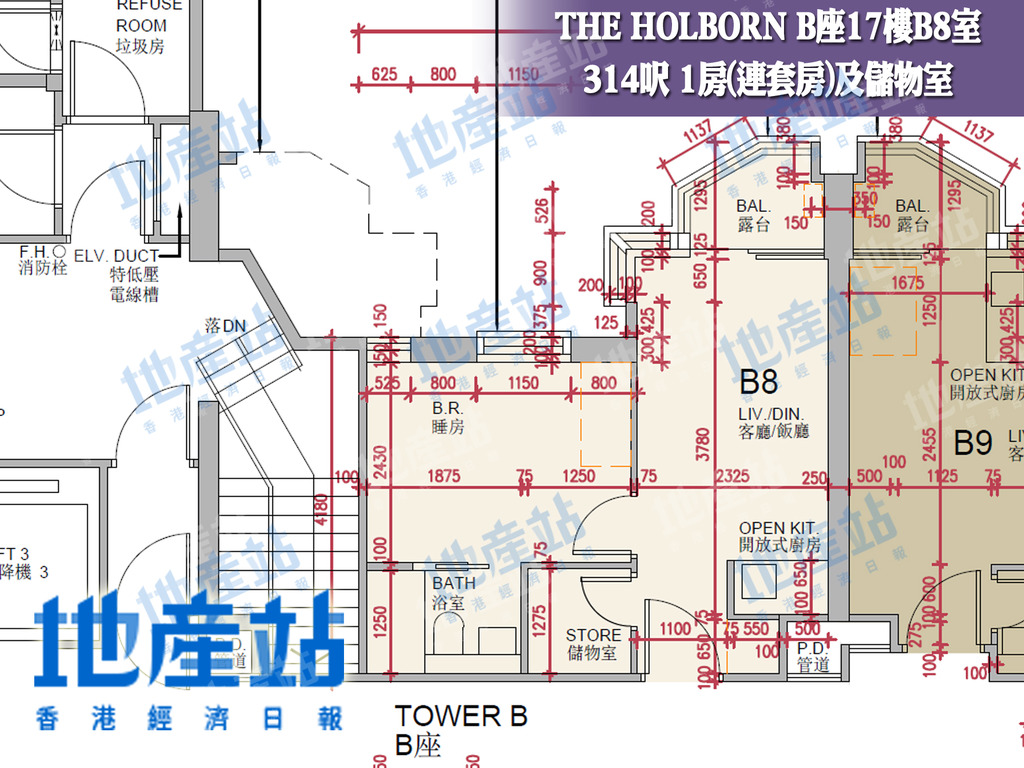 THE HOLBORN 17樓同為標準樓層,不過與其他樓層有分別,一層只有16伙單位,15伙單位與其他樓層的開則分別不大;17樓沒有B7室單位,而B8室單位換成1房(連套房)及儲物室間隔,全座住宅僅得唯一一間同類單位,面積314平方呎。