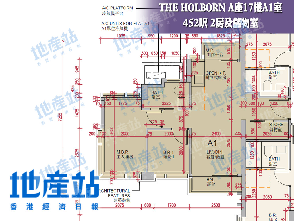 THE HOLBORN A座A1室單位屬於2房連儲物室間隔,為標準單位最大,入屋設長2.35米及闊1.05米玄關,旁邊為儲物室空間,廳區為左右廳布局,工作平台及露台各分布於廳區兩端,故單位可享兩邊景觀,料高層單位景觀開揚,短走廊連接一細一大睡房,細睡房長闊均為2米,方形設計,主人睡房面向筲箕灣道設曲尺窗,而另一邊則亦有落地窗戶,採光度高,浴室設有窗戶外連冷氣機平台。
