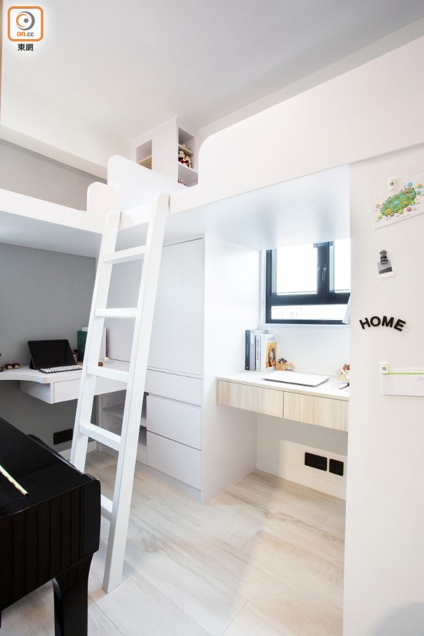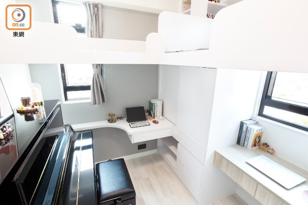 為增加女兒睡房可用空間,設計上向高空發展,下方擺放鋼琴外,兩名女兒亦有獨立書枱。