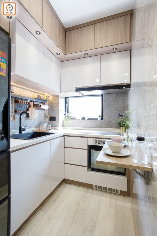 廚房工作枱面有限,故增設一塊可摺疊層板(圖右)以方便煮食,毋須使用可收起以節省空間。
