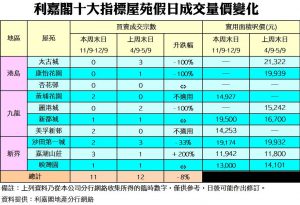《利嘉閣十大指標屋苑假日二手實況》 一手續主導大市 買家需時積累 十大屋苑周末買賣11宗 低位徘徊