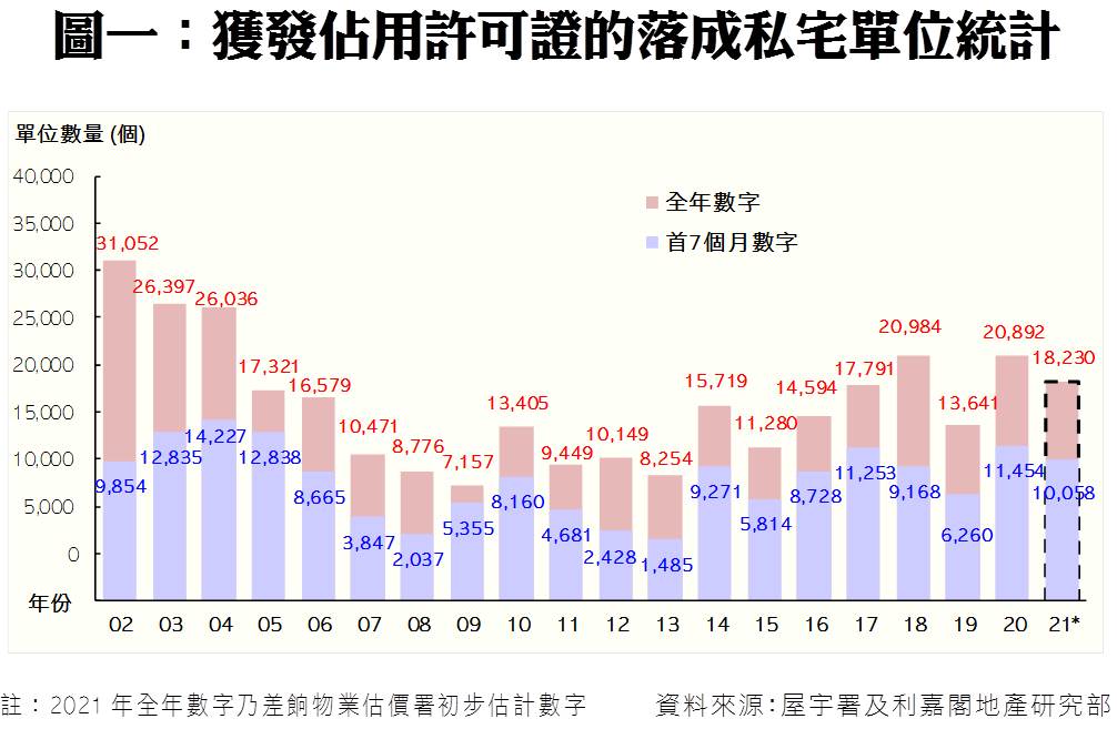 陳海潮指出,今年首7個月私樓落成量佔差估署全年預測的18,230伙約55%,進度大致符合預期,而估計年內仍有一些大型項目可望趕及取得入伙紙,當中包括青衣「明翹匯」(776伙)、屯門「Oma By The Sea」(517伙)、日出康城「Grand Montara」(504伙)、旺角「利奧坊‧曦岸」(488伙),以及長沙灣「AVA 228」(160伙)等,再加上其他中小型項目,初步估計2021年全年落成量可達1.6萬至1.8萬伙水平。