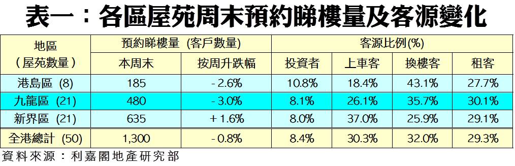 利嘉閣地產研究部主管陳海潮表示,雖然多個新盤登場,市場氣氛熾熱,部分向隅客回流二手,惟樓價高位試頂,買家取態較為觀望,而且部分家庭提早於周末慶祝中秋節,導致指標屋苑預約睇樓量偏軟。根據利嘉閣地產研究部數據估算,全港50個指標屋苑共錄1,300組客戶於周末預約睇樓,按周微跌0.8%。港股持續走弱創年內新低,削弱投資買樓信心,資金或傾向審慎而行。