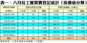 按物業價格組別作分析,在7個價格組別的工廈買賣登記當中,八月份錄得4升3跌(詳見表一);當中1,000萬元以下的三個組別登記量全線下跌,當中登記佔比最多的200萬至500萬元以內組別錄得10%的跌幅,登記量由前月的158宗,降至上月的142宗,反映中細價工廈登記有所回氣。至於中高價工廈則逆市上升,其中銀碼介乎5,000萬至1億元以內的組別,錄4宗登記,按月大增1倍,而1億元或以上者亦增50%,月內共達6宗。此外,上月貴重工廈登記個案當中,以屯門東亞紗廠工業大廈一期全幢的近22.43億元登記最矚目,其次為葵涌中央工業大廈全幢的9億元登記,再者為粉嶺勉勵龍中心全幢的逾6.95億元。