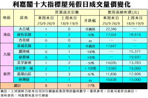 利嘉閣地產總裁廖偉強表示,二手樓價在破頂後持續在高位爭持,業主普遍叫價強硬,買家高追動力轉弱,雙方陷入拉鋸。加上有一手新盤搶焦點,令周末十大屋苑交投持續受壓。綜合利嘉閣地產分行網絡數據,在過去的周末日(9月25日至9月26日)十大指標屋苑累錄8宗二手成交個案,與上周末(9月18日至9月19日)的11宗比較,按周減少27%,為新春假期以來,相隔32周後,首度跌穿雙位數水平。
