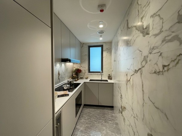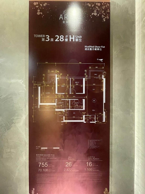 中洲置業旗下沙田星凱·堤岸周三(29日)首度開放2個示範單位予傳媒參觀。其中,分別為參照第3座28樓H室搭建的經改動示範單位及交樓標準單位,實用面積755方呎,單位的大廳長約6米、闊約3米,連接26方呎露台,屬三房一套間隔。