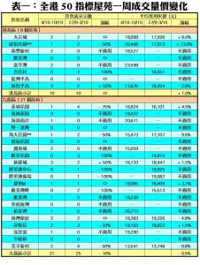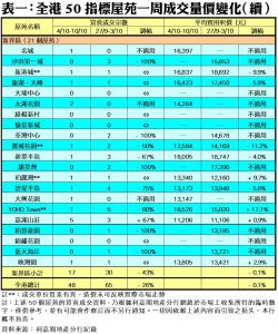至於,港島區8個指標屋苑上周共錄10宗交投,與前周的成交量相同,其中康怡花園只錄得1宗成交,較前周的2宗減少50%;藍籌屋苑太古城上周錄得2宗買賣,與前周宗數持平;海怡半島交投量則由前周的2宗,增加50%至上周的3宗;惟鯉景灣、杏花村及藍灣半島上周暫未錄得成交,齊齊「捧蛋」。此外,在全港50個指標屋苑當中,上周共有20個屋苑錄得「零成交」,較前周的21個減少5%,當中九龍區及新界區各佔8個及9個,港島區則佔3個(詳見表一)。