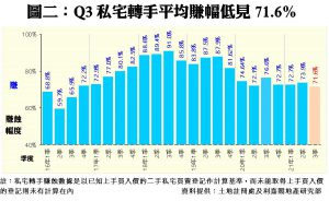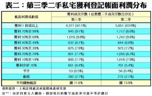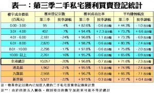 至於平均獲利幅度方面,今年第三季每宗私宅轉手個案平均賺幅為71.6%,較第二季的73.9%回落2.3個百分點,連續4季處於七成邊緣窄幅徘徊,並創下2016年第四季以來的20季(即5年)新低,反映股市不濟及樓價高位遇壓,賺幅減少。當中,沽樓獲利1倍或以上的轉手個案佔整體二手私宅買賣比例仍達42.1%,惟按季下跌1.8個百分點,涉及宗數達4,377宗。此外,虧損個案錄得282宗,佔比2.7%,相關比例按季增加0.6個百分點(詳見表二),反映股市下瀉影響部分急需套現的業主無奈蝕讓。