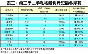 若以屋苑計算,第三季二手私宅獲利登記宗數最多的屋苑首3位依次是日出康城、嘉湖山莊及新都城,分別錄得167宗、147宗及112宗登記,獲利成功比率分別達94.4%、99.3%及100%。至於十大獲利登記宗數最多屋苑之中,則以維景灣畔的每宗轉手個案平均賺幅最大,高近1.5倍;而平均賺幅較低者則為日出康城的43.7%。
