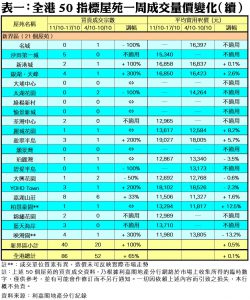 至於,九龍區21個指標屋苑上周共錄30宗交投,按周增加36%,其中黃埔花園上周共錄得5宗買賣,較前周的2宗急增1.5倍;美孚新村成交量由前周的2宗,增加1倍至上周的4宗;此外,在全港50個指標屋苑當中,上周共有15個屋苑錄得「零成交」,較前周的19個減少21%,當中九龍區及新界區各佔6個及7個,港島區則佔2個(詳見表一)。