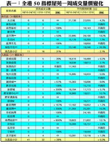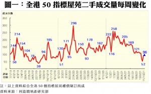 利嘉閣地產董事陳大偉表示,本月初施政報告出爐後,本港樓市前景明朗化。加上二手市場已淡靜多時,部分業主態度軟化,願意提供1%至3%的議幅,令資金入市意欲稍回升。綜合利嘉閣地產分行數據所得,全港50個指標屋苑於上周(18/10—24/10)共錄96宗買賣個案,較前周(11/10—17/10)的90宗增加7%,連續兩周增加並創近四周新高。