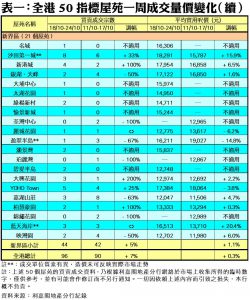 至於,港島區8個指標屋苑上周共錄11宗交投,按周減少31%,其中太古城、杏花村及海怡半島交投量按周持平,各自錄得6宗、1宗及1宗成交;不過,期內康怡花園、南豐新村、鯉景灣及藍灣半島則暫未錄得成交,齊齊「捧蛋」。此外,在全港50個指標屋苑當中,上周共有16個屋苑錄得「零成交」,較前周的15個增加7%,當中港島區及新界區各佔4個及3個,九龍區則佔9個(詳見表一)。