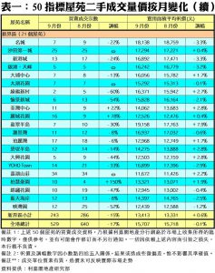 場反應定行止,故料十月份尤其上半月,指標屋苑交投量價仍均會持續受壓,至下半月新盤開售反應良好,才再帶動整體大市氣氛。廖氏預計十月份50指標屋苑交投量料再跌約兩成,跌至四百餘宗;至於樓價亦恐按月再微跌0.5%至1%以內,持續整固;不過,觀乎近日一手表現理想,加上二手亦有回升跡象,相信十一月份指標屋苑量價均可重返升軌,後市並不悲觀。