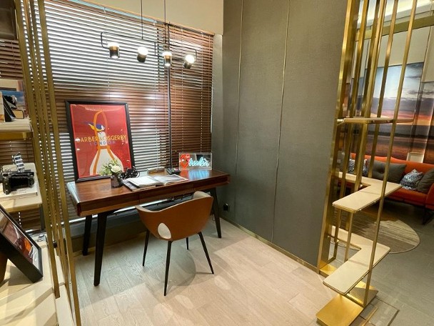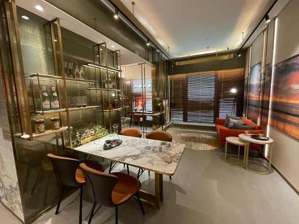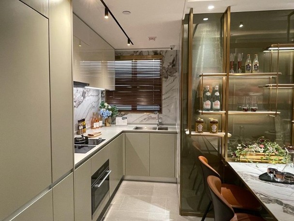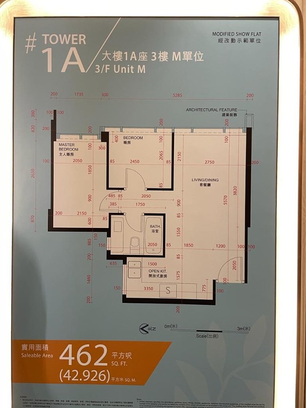 楊氏指,兩房單位連裝修示範單位參照 1A座3樓M室,實用面積462方呎。單位採現代風格設計,客飯廳以長方形開則,擺放梳化及餐枱等家具,配襯金屬飾架。另外,單位設開放式廚房,可作明火煮食,並附有窗戶。