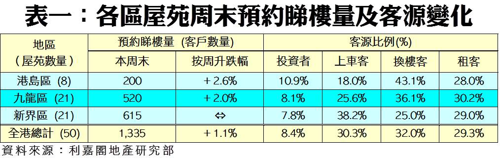 利嘉閣地產研究部主管陳海潮表示,各區新盤列隊登場,帶動整體市場氣氛回升,而部分觀望已久的買家亦蠢蠢欲動,於周末出動探盤尋寶。根據利嘉閣地產研究部數據估算,全港50個指標屋苑共錄1,335組客戶於周末預約睇樓,按周再增1.1%,連升三星期。
