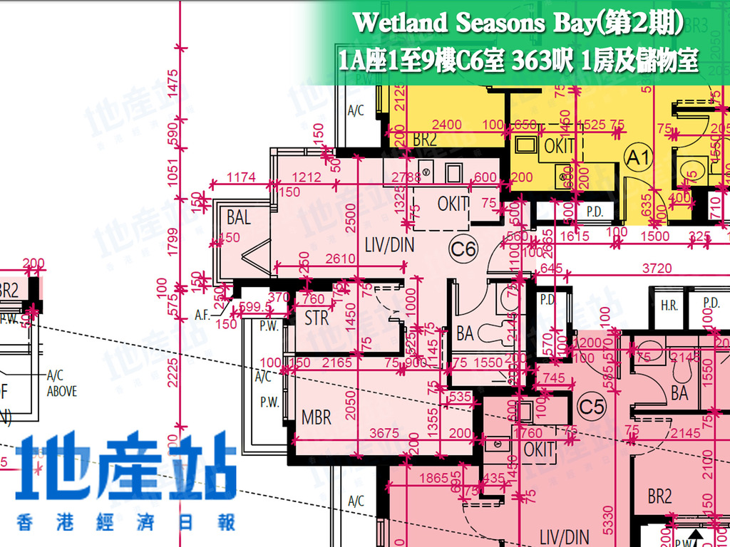 Wetland Seasons Bay第2期1房及儲物室單位分布第1A座A3、B1、C6室,以及第1B座A3、B1及C6室單位,中低層面向別墅,料高層景觀較佳。單位開則相似但有分夥。例如A3室、C6室單位玄關旁有小櫃位;B1室單位儲物室及睡房位置雖然與廳區方向一致,但其位置較廳後;B1室、C6室大廳設L形廳,方便屋主在大廳賞景。