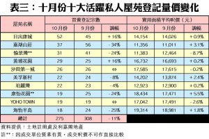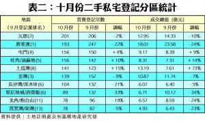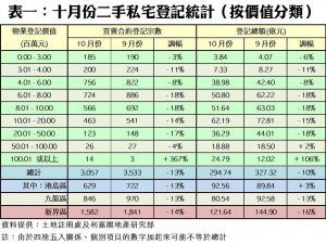 今年十月份,按二手私宅價值分類,9個價格組別的買賣登記量錄得八跌一升,跌者當中,以601萬至800萬元及801萬至1,000萬元的兩個組別跌幅最大,兩者按月同跌18%,其中前者由九月的886宗減少18%,至上月的724宗,後者則跌至566宗(見表一)。至於登記量佔比最多的401萬至600萬元組別則錄得756宗,按月也跌8%。