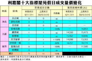 利嘉閣地產總裁廖偉強表示,一手市場分散多區連日推盤,搶去市場焦點,導致二手屋苑交投冷清,再次跌至單位數淡局。綜合利嘉閣地產分行網絡數據,在過去的周末日(11月6日至11月7日)十大指標屋苑累錄5宗二手成交個案,較上周末(10月30日至10月31日)的11宗按周跌55%,為近四周最少。