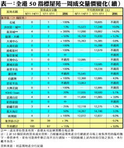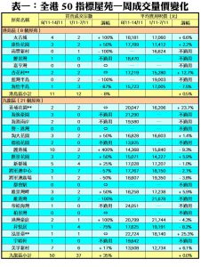 至於,港島區8個指標屋苑上周共錄11宗交投,較前周的12宗減少1宗或8%,其中海怡半島上周只錄得1宗買賣,較前周的3宗大減67%;南豐新村、嘉亨灣及藍灣半島期內均暫未錄得成交,齊齊「捧蛋」;太古城及康怡花園交投量則分別按周增加1倍及50%,上周各錄4宗及3宗買賣。此外,在全港50個指標屋苑當中,上周共有15個屋苑錄得「零成交」,與前周的數量相同,當中港島區及九龍區各佔3個及4個,新界區則佔8個(詳見表一)。