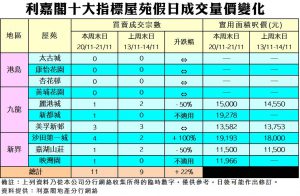 利嘉閣地產總裁廖偉強表示,本港抗疫多時,最近內地與香港兩地通關漸見曙光,市民寄望經濟會進一步復甦,樓價會繼續上揚,刺激部分買家加快入市決定。加上近月多個新盤接二連三開售,大批落空買家陸續回流二手市場,整體二手交投稍回暖。綜合利嘉閣地產分行網絡數據,在過去的周末日(11月20日至11月21日)十大指標屋苑累錄11宗二手成交個案,較上周末(11月13日至11月14日)的9宗按周升22%,相隔三周後重上雙位數。