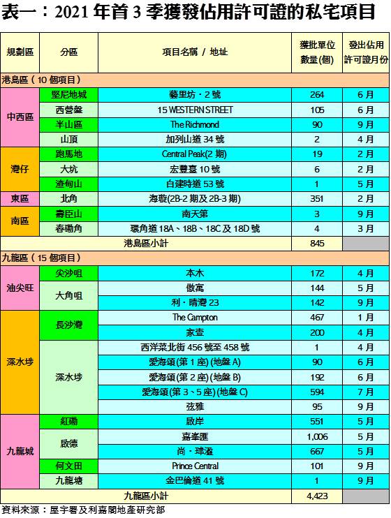 利嘉閣地產研究部主管陳海潮表示,根據屋宇署今天最新發表的資料月報顯示,2021年九月份全港共有9個項目,涉及603個私人住宅單位落成(以屋宇署發出佔用許可證的樓宇數量為準),較八月份508伙增加19%。另外,今年首3季合共43個項目、涉及11,169伙私宅落成,較去年同期的13,688伙按年減少18%。