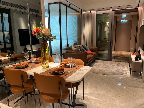 至於三房連裝修經改動示範單位參照28樓A室,實用面積770方呎。單位客廳設計以暖色為主調,放置圓形餐枱配襯其卡色餐椅,特別打造一幅鏡面牆身,有助擴闊整體空間感,鏡面牆後為儲物室,惟設計師將原則的儲物室空間縮減,撥作飯廳空間。