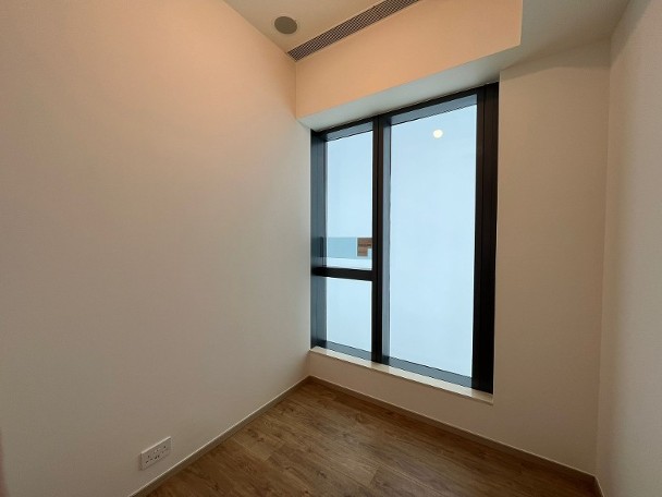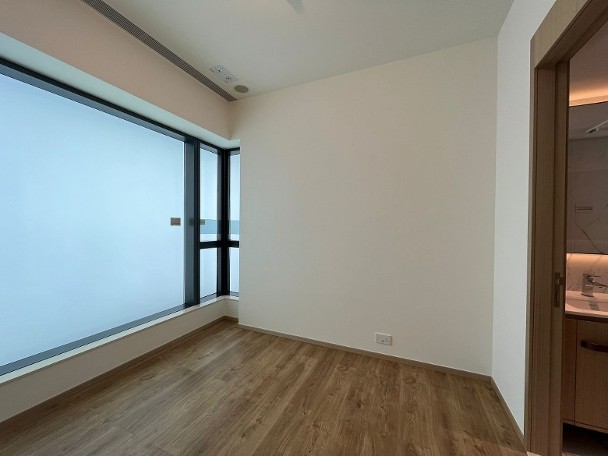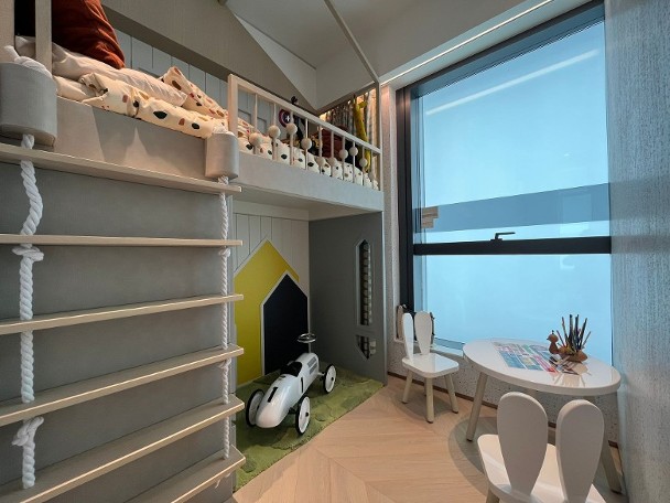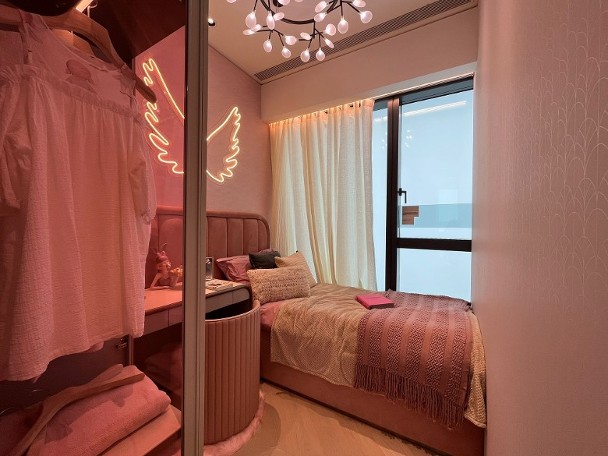 睡房方面,其中一間以粉紅色為主色作佈置,另一間則放置高架床及玩具車,設計成兒童睡房,而主人睡房放置雙人睡床,空間足夠三邊落床,房內連接套廁。 發展商同時開放上述的交樓標準示範單位,清晰可見原本的儲物室連廁的間隔。