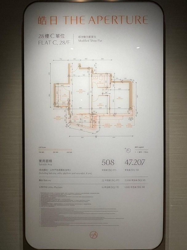 其中一個連裝修經改動示範單位參照28樓C室,實用面積508方呎,單位原則屬兩房間隔,設計師將兩間睡房打通,在房內放置雙人睡床及書枱,浴室設於房內,備有浴缸及鏡櫃。客飯廳放置梳化及4人餐桌後,仍有不少走動空間,對外就連接由露台、工作平台及冷氣機平台結合的三合一環保露台。廚房設有雪櫃、煤氣煮食爐、蒸焗爐等家電。值得留意是,買家可選擇不同顏色的雪櫃門板。