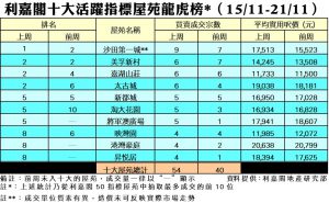 利嘉閣地產董事陳大偉表示,近日多區有新盤湧現,在一手市場活躍交投下,不少向隅客亦密切關注二手市場,加上部分屋苑業主開放議價空間,促使二手屋苑成交個案增加。綜合利嘉閣地產分行數據所得,全港十大活躍指標屋苑在上周(15/11–21/11)錄54宗買賣個案,較前周(8/11–14/11)的40宗按周上升35%,平均每個屋苑錄約5至6宗成交。